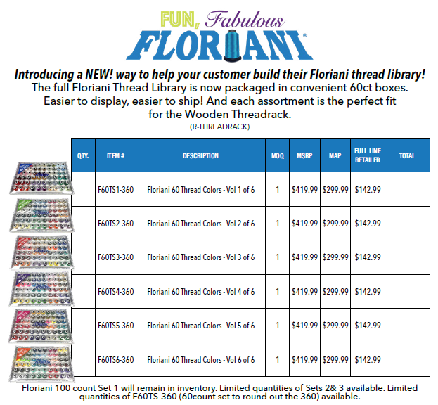 Once you’ve got it set up in your store, take a picture of it! Send the photograph to info@rnkdistributing.com, and we’ll apply a $25.00 credit to that store’s next purchase from RNK Distributing! AND, we’ll share the picture on Floriani’s Facebook page, along with your store’s name and city/town, so Floriani fans know where to find their Floriani thread!